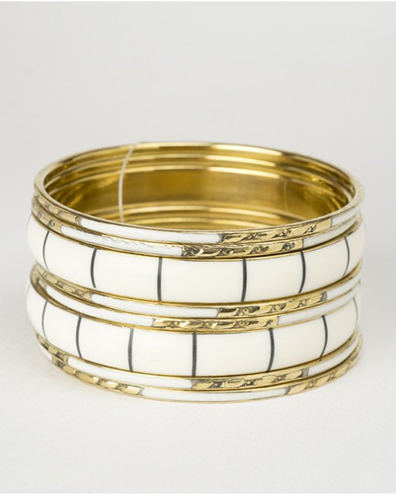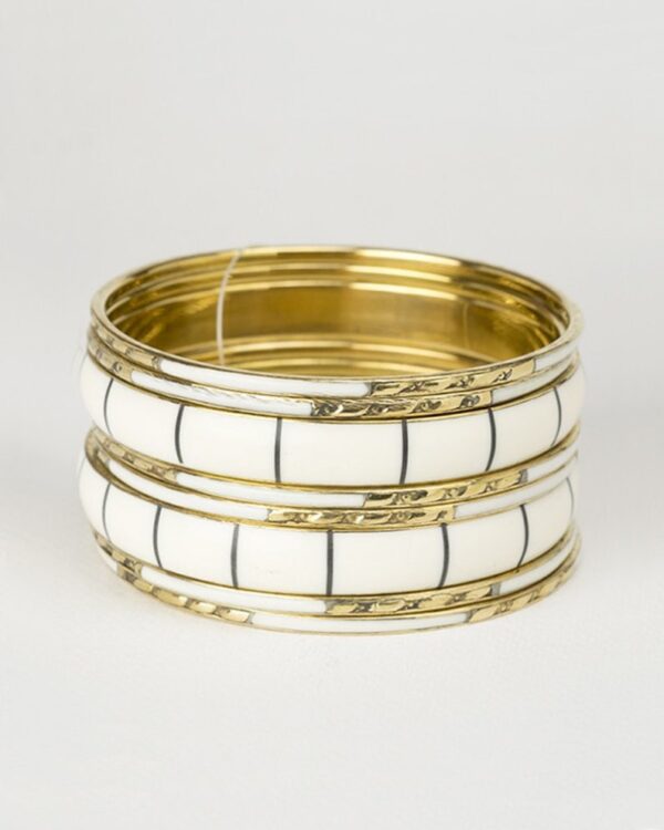 Add an elegant touch to your accessory collection with this exquisite set of 4 handcrafted bangles, featuring white bone inlay with delicate black accents, beautifully framed with gold-tone brass edges. These bangles exude vintage charm while maintaining a modern appeal, making them perfect for any occasion.