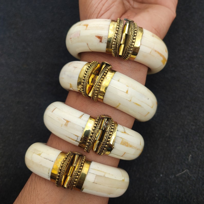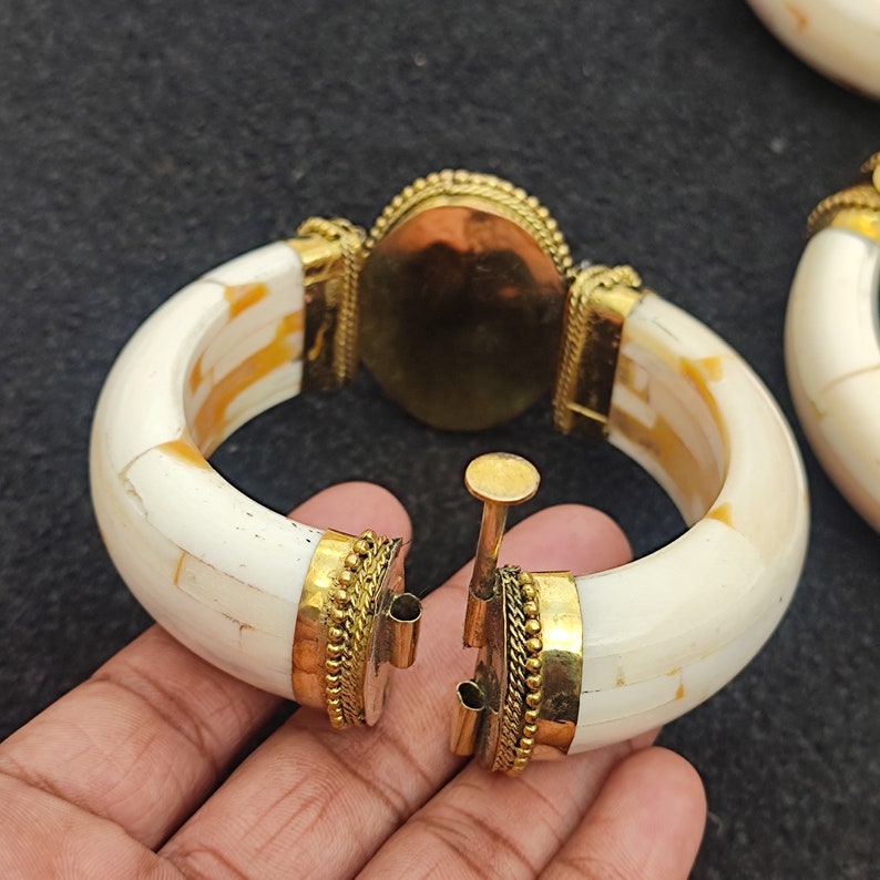 The natural bone structure is complemented by intricate brass detailing, making it an eye-catching statement piece for both casual and festive wear.