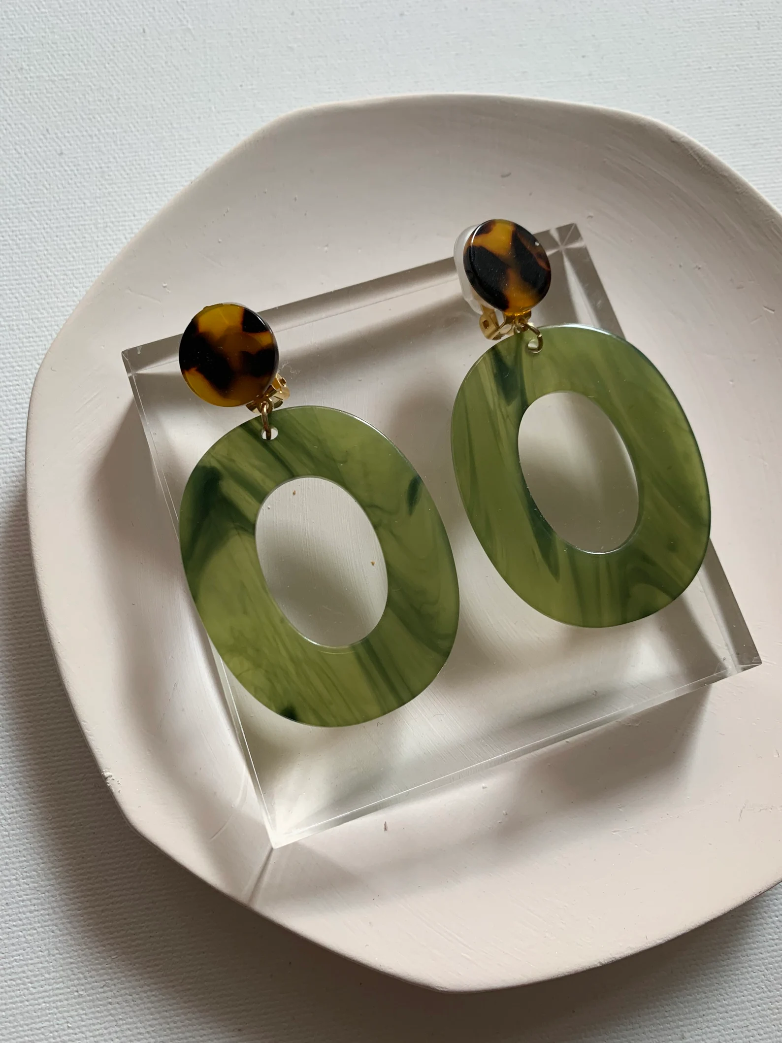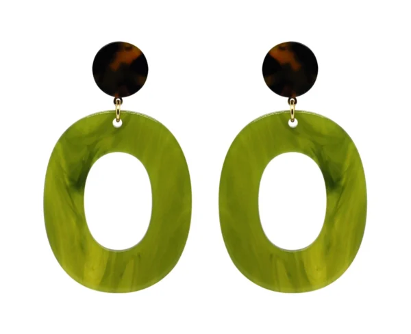 Make a bold statement with these handmade resin earrings featuring a stylish green marbled oval drop with a tortoiseshell stud. These lightweight earrings are the perfect blend of modern and vintage aesthetics, making them an excellent choice for casual and formal occasions alike.