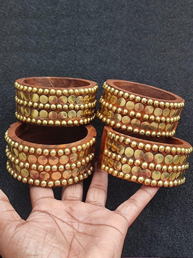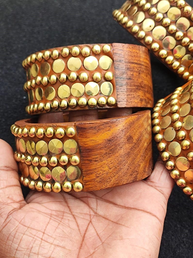 Make a bold statement with this exquisite handcrafted wooden cuff bracelet, adorned with brass stud detailing. The rich natural wood grain pairs beautifully with the hammered and beaded brass embellishments, creating a vintage, boho-chic look.