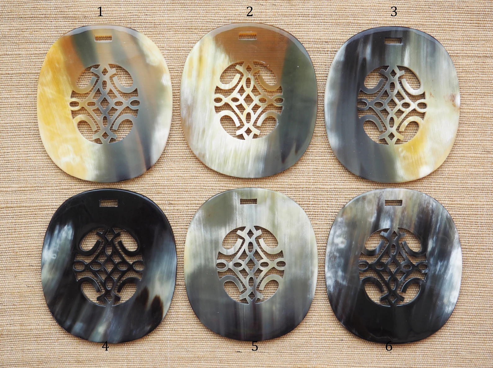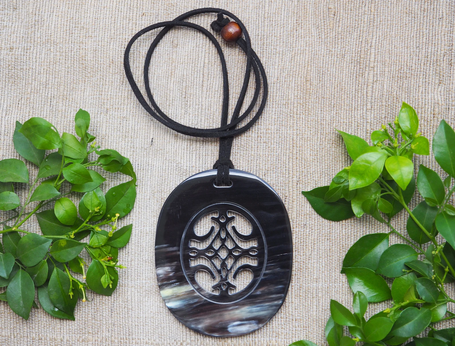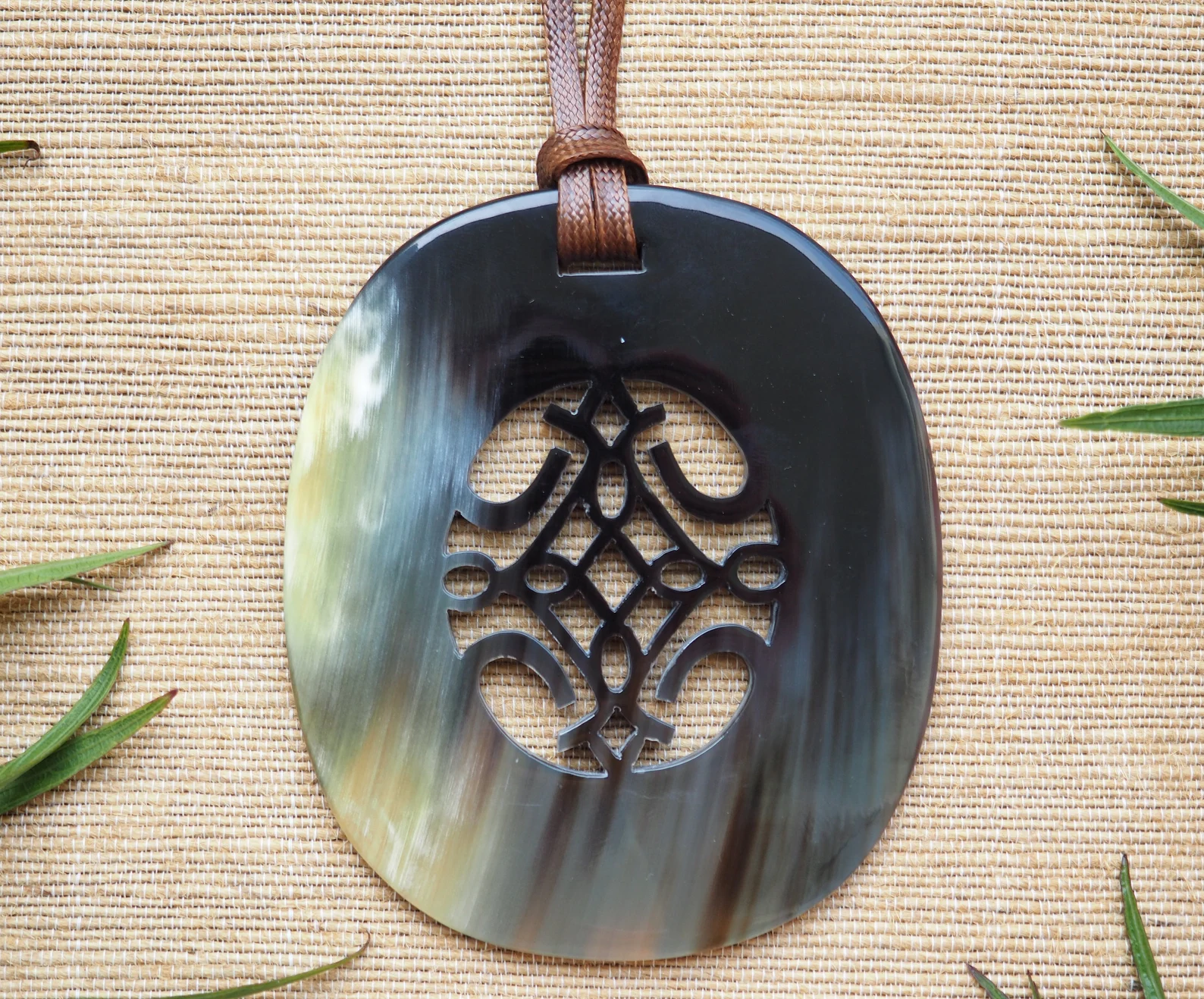 This exquisite handcrafted pendant necklace is made from natural horn, featuring a stunning cut-out design with an organic finish. The rich blend of dark and light tones enhances the natural beauty of the horn, making it a perfect statement piece for any outfit.