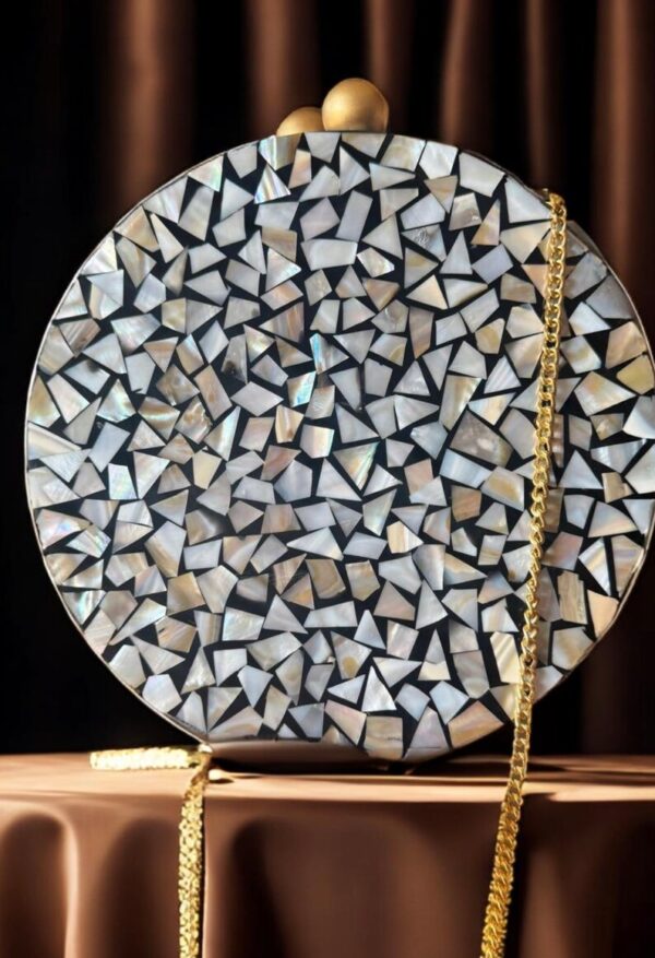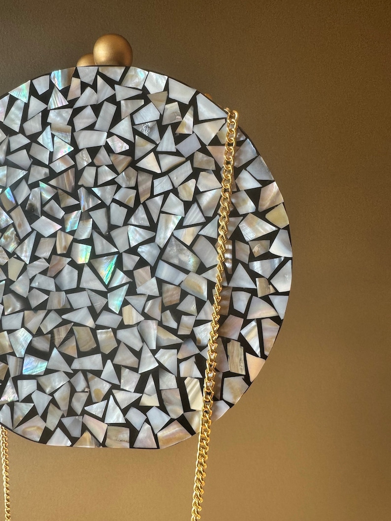 Make a dazzling impression with our Handmade Round Clutch, designed with a striking mosaic of natural Mother of Pearl fragments embedded in rich resin. This bold circular silhouette is both a modern fashion statement and a timeless keepsake, handcrafted with precision and care. Paired with a chic gold chain, it’s perfect for weddings, cocktail parties, or adding sparkle to your evening outfit.