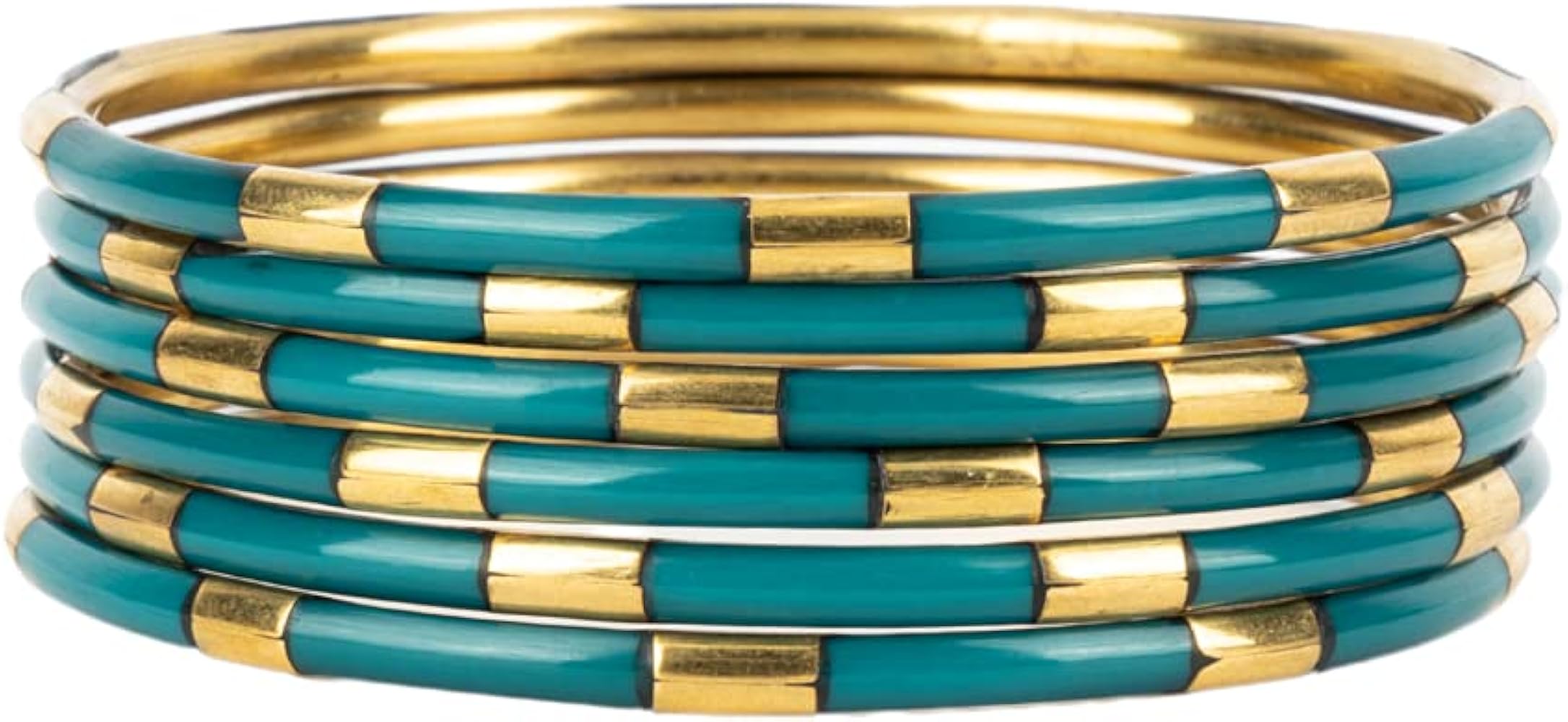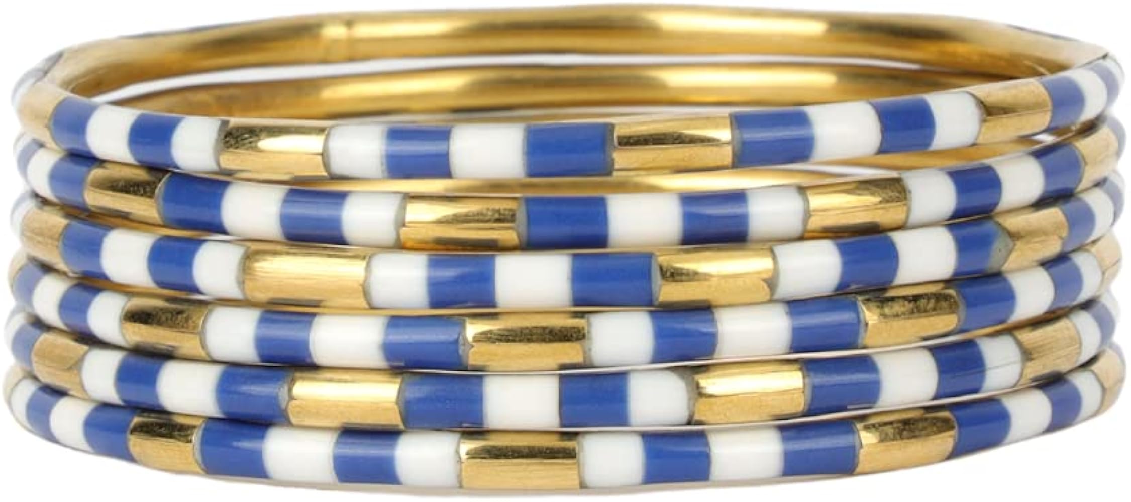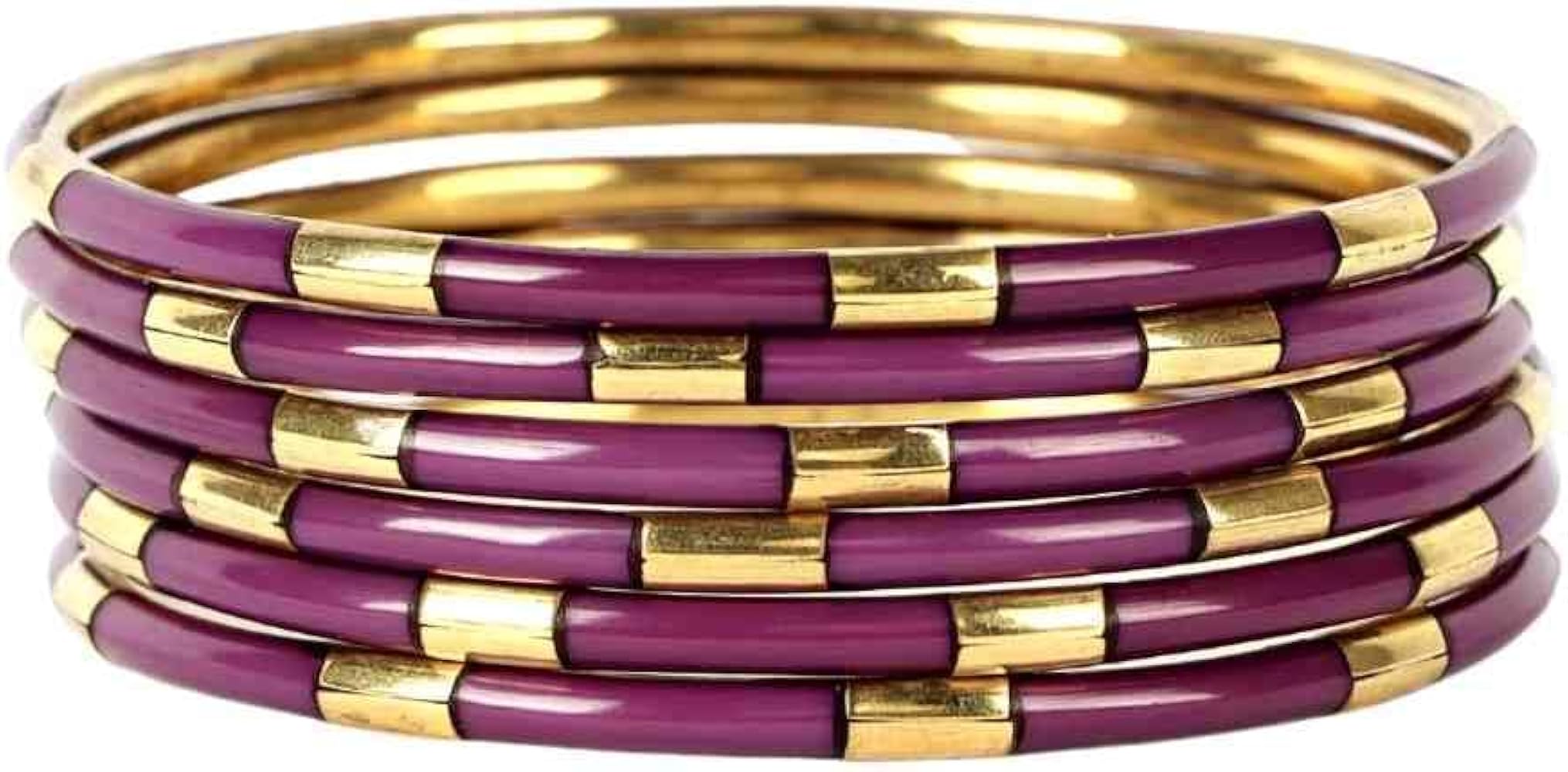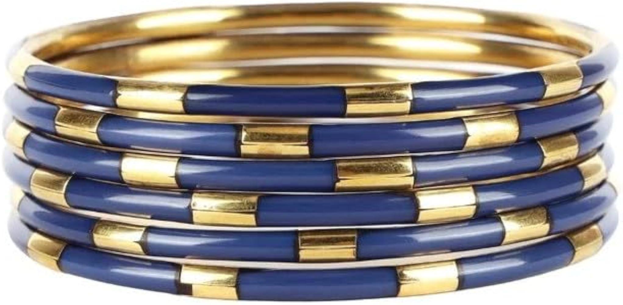 Elevate your style with this stunning set of handcrafted bangles, featuring a royal blue enamel finish beautifully accented with gold-tone brass inlays. The perfect blend of modern sophistication and traditional craftsmanship, these bangles add a touch of regal charm to any outfit.
