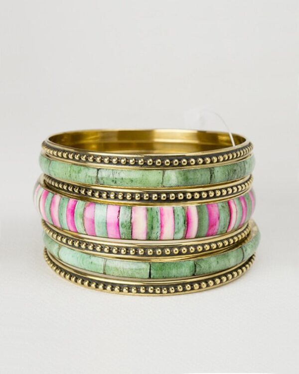 Elevate your jewelry collection with this exquisite brass bangle set featuring stunning stone inlay work. The vibrant green and pink hues, combined with antique gold beaded edges, bring a perfect balance of elegance and tradition. Handcrafted by skilled artisans, these bangles are lightweight, durable, and designed to complement any ethnic or fusion outfit.
